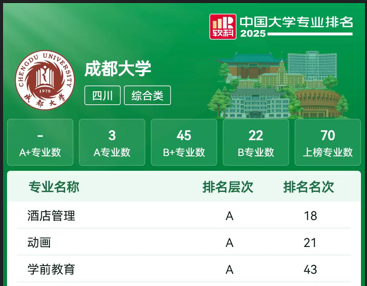 我校70个专业上榜2025软科中国大学专业排名近日,高等教育专业评价机构软科发布2025“软科中国大学专业排名”。我校70个专业上榜,上榜总数位列全省高校第七。在今年软科大学专业排名中,我校有3个专业评级为A,较上年增加2个;45个专业评级为B+,较上年增加8个,增加率为21.6%;22个专业评级为B,专业整体评级上升趋势明显。评级为A的专业分别为动画、学前教育和酒店管理,3个专业的综合排名进入全国前10%。其中,动画专业连续五年评为A,学前教育和酒店管理为今年新增A专业。软科中国大学专业排名是迄今为止覆盖专业数量最多、参...202025-06