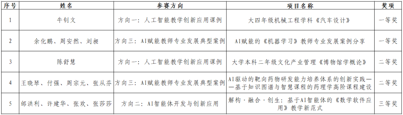 我校在四川省首届教师人工智能应用能力大赛中斩获佳绩9月19日,四川省教育厅公布了首届教师人工智能应用能力大赛获奖名单,我校在高等教育组别中表现优秀,共获得两个一等奖、两个二等奖和一个三等奖,展现了我校教师在人工智能与教育融合创新领域的实践成果。四川省首届教师人工智能应用能力大赛我校教师团队获奖情况一览表本届大赛由四川省教育厅主办、成都师范学院承办,以“AI赋能教师专业发展,数智创变未来课堂”为主题,旨在提升教师的人工智能应用能力,推动教育数字化转型。比赛设置“人工智能教学创新应用课例”“AI教育智能体设计与创新应用”“AI赋能...252025-09