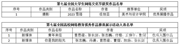 在收到活动通知后,学校党委网信办积极响应,广泛动员全校师生参与,精心组织校内初赛,共征集到教师作品17件,学生作品125件,经院、校层层筛选,选报40件作品参赛。最终,美术与设计学院任炟亚同学的摄影作品《2023雪落》获优秀展播作品,曾思澄、张长剑、张志巍、付楷、王焕举、曹熠老师的微视频《青年来信》,和张志巍、冯潇、曾思澄、曹熠、陈扬、张长剑老师的微视频《你是我的阳光》获优秀入围作品。