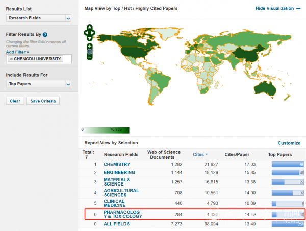 在本期ESI数据中,我校高被引论文250篇,位列在川高校第4位。药理&毒理学科统计的论文共284篇,总被引频次4030次,全球排名第1265名。已进入ESI全球前1%的工程学、农业科学、化学、材料科学和临床医学5个学科较上一期有进一步提升,工程学学科论文总数1144篇,总被引频次18129次,位列全球第819位,上升22位;农业科学学科论文总数708篇,总被引频次10551次,位列全球第500位,上升18位;化学学科论文总数1282篇,总被引频次21827次,位列全球第988位,上升29位;材料科学学科论文总数1257篇,总被引频次16815次,位列全球第878位,上升46位;临床医学学科论文总数440篇,总被引频次4793次,位列全球5759位,上升83位,发展势头良好。