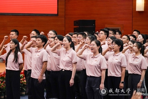“我志愿成为一名人民教师,忠诚党的教育事业,遵守教育法律法规,履行教书育人职责,引领学生健康成长……”成都市优秀青年教师向达兵教授带领新进青年教师进行入职宣言。全体新进教师面向国旗宣誓。