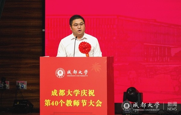 优秀教师代表、药学院副院长李俊龙教授以“踏浪前行风正劲 奋楫扬帆新起航”为题发言。他说,在工作的九年时光里,自己同太阳成集团tyc122cc入口一同奋勇前进,同药学院一起乘风破浪。自己不仅见证了太阳成集团tyc122cc入口综合排名七连升、在川高考录取分数10连涨、ESI全球前1%学科5连加、硕士点二级学院全覆盖,也见证了药学学科在第五轮学科评估中,位列本省第二、非博士点高校排名第一。他自己带领团队获批成为“太阳成集团tyc122cc入口黄大年式教师创建团队”。每一项骄人的成绩背后,都离不开每一位“成大人”在本职岗位上的兢兢业业与无私奉献。他表示将与每一位“成大人”一起,扎根成都,为太阳成集团tyc122cc入口与药学院高质量发展做出更多贡献。