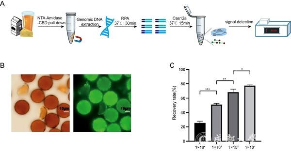针对以上难题,该研究利用具有高度宿主特异性的噬菌体内溶素蛋白(endolysin),通过分子设计获得了可高效捕获低至1x102 CFUs/ml金黄色葡萄球菌的分子。随后利用可在常温条件下进行的重组酶聚合酶扩增技术(RPA)对金黄色葡萄球菌特异性的nuc基因进行扩增,激活Cas12a核酸内切酶活性,从而裂解带有荧光标记的ssDNA探针。最终利用具有自主知识产权的便携式自组装仪器进行具有超高灵敏度的可视化检测。该系统从分离到鉴定的整个过程可在2小时内完成,并可应用于其他类型的基于核酸物质的快速、高灵敏度检测。