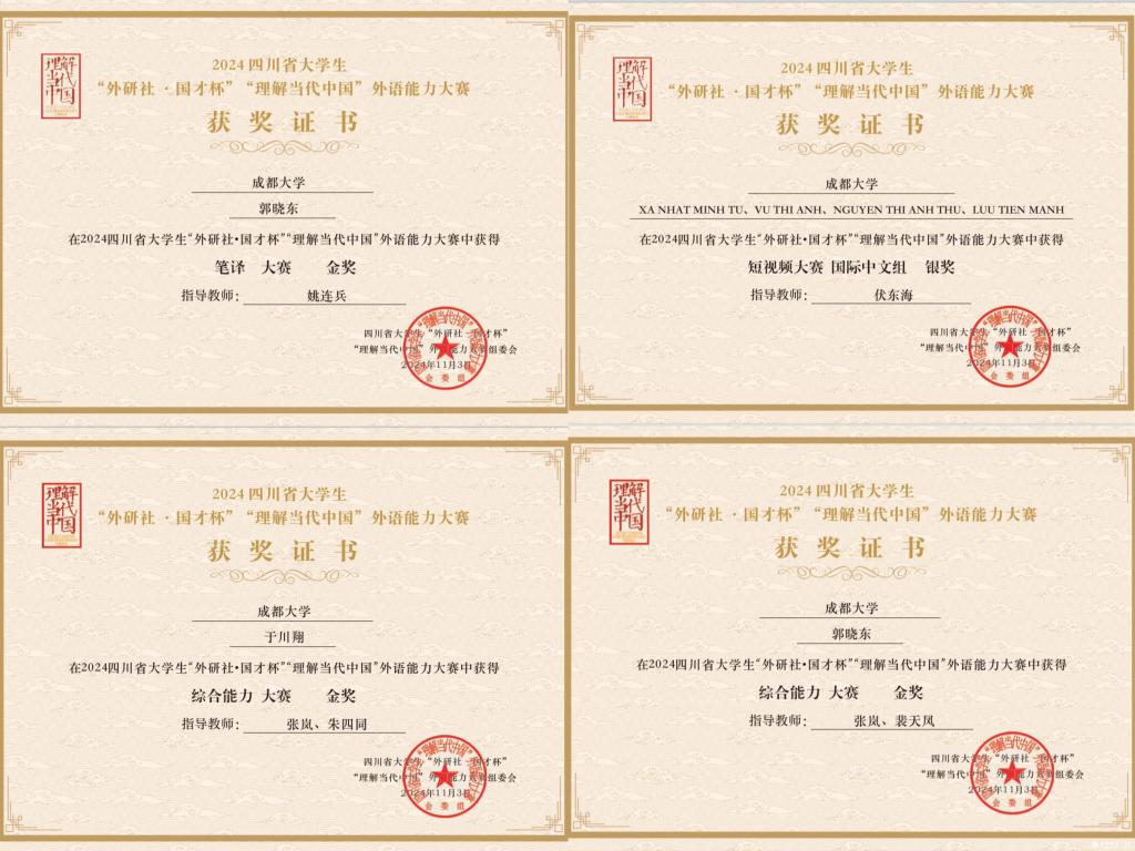 11月2日至3日,“外研社·国才杯”“理解当代中国”四川省大学生外语能力大赛在成都师范学院顺利落幕。我校学子在决赛中斩获金奖3项(晋级国赛)、银奖3项(一项晋级国赛)、铜奖4项,取得学校参加该比赛以来的最好成绩。