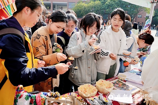 文化的探索远不止于此,随后“丝路行者盲盒探险挑战”正式开启。500份精心准备的“丝路行旅 大道同行”挑战盲盒,等待着勇敢的探险者。参与者们化身丝路商人、使者、探险家或学者,穿梭于各国展位之间。“缅甸的首都在哪里?如何用越南语问好?”通过完成一系列趣味横生的互动任务,参与的同学们不仅获得了新的知识,也解锁了异国美食的秘密。从摩洛哥的清新薄荷茶到马来西亚的醇厚仁当鸡,从俄罗斯的香甜煎饼到各式各样的异国糖果,每一站都是味蕾的惊喜,每一次尝试都是对未知文化的一次勇敢探索。