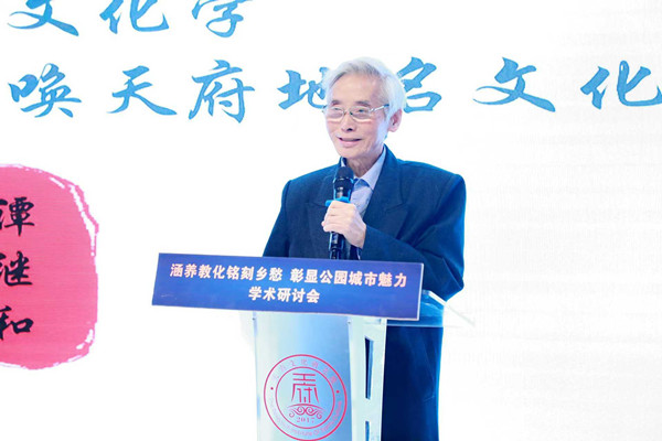 谭继和先生以“新时代呼唤地名文化学,天府文化需求呼唤天府地名文化学”为题做了主题发言。他认为地名文化是指地名作为祖源记忆与历史文脉的地标与坐标,是各地域文化共同体认同凝聚意识的标识与标志。各地域的地名文化的会通、兼容、凝聚、向心,即构成多元一体、多源一脉的“中华地名文化共同体”中华祖源记忆与文化认同意识,对推动国家认同、民族认同、中华地名认同有重大作用。谭继和先生即以自身创作《金牛文脉赋》和参与多项文化研究工作的经历为例,指出地名可以为文赋增色,可以为学术研究和文化建设工作提供重要线索。据此,他建议加强对地名的文脉探索,挖掘其历史底蕴、文化内涵、现实价值,围绕新旧地名的命名和改名,构建一门系统学问。