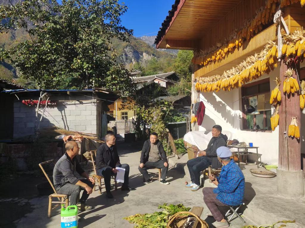九寨沟县双河镇顺河村中,一群村民正热情地围住驻村工作队队员严峰,谈天交流。今年是他驻村帮扶的第二年。