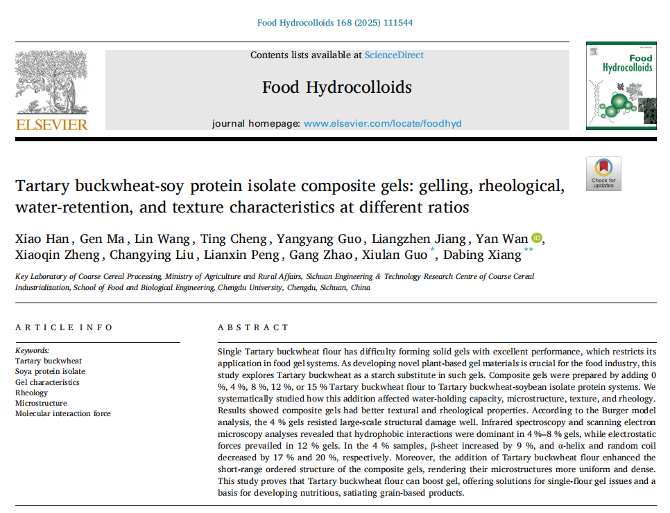 近日,我校食品与生物工程学院杂粮实验室研究生在Food Hydrocolloids(中科院一区top,IF=11.0)发表题为"Tartarybuckwheat-soyproteinisolatecompositegels:gelling,rheological,water-retention,andtexturecharacteristicsatdifferentratios"的研究论文,食品加工与安全领域2022级研究生韩晓为第一作者,向达兵教授和郭秀兰教授为通讯作者,太阳成集团tyc122cc入口为第一署名和通讯单位。
