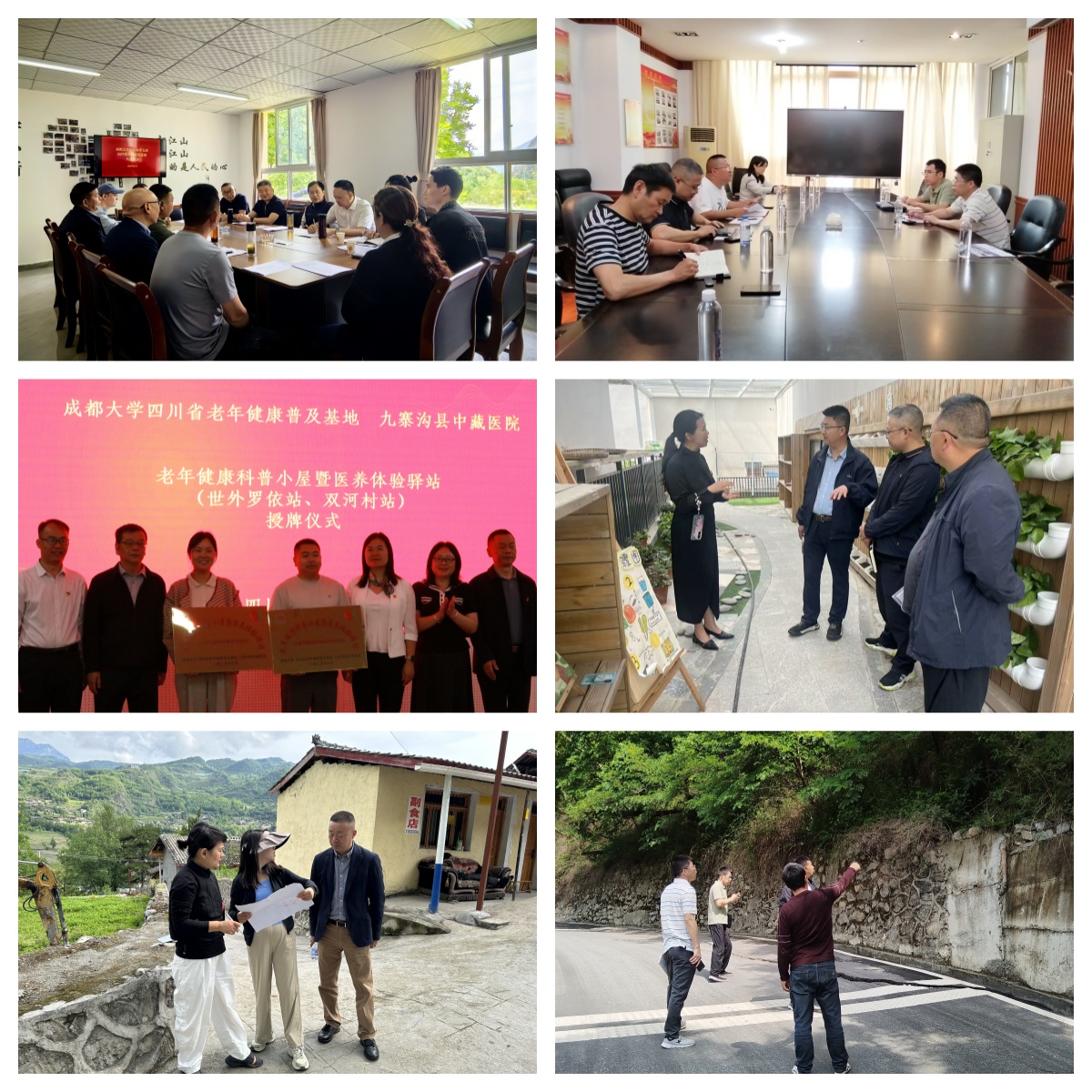 在九寨沟县期间,工会(帮扶办)党支部与双河村开展党支部结对共建活动,向双河村捐赠了“村“两委”干部和致富带头人能力素质提升考察学习培训及产业发展经费”;科技处同县科学技术和农业畜牧局洽谈畜牧生产、项目联合申报等内容,共同推进校地农业科技创新工作;基础医学院、四川省老年健康普及基地党支部与九寨沟县中藏医院开展“红润医心,智护银龄”党建共建活动,签订共建协议,揭牌“四川省老年健康普及基地(九寨沟县站)”,为“老年健康科普小屋暨医养体验驿站”(世外罗依站、双河村站)授牌;师范学院与九寨沟县教育局对接名优骨干教师培训、幼儿园教师全员培训、教育系统后备干部及校(园)长培训项目,并前往县启航幼儿园了解和商议乡村教育振兴博士工作站下半年帮扶事项;旅游与文化产业学院专家前往双河镇罗依片区,实地考查打造“世外罗依 千户藏寨”的全域旅游示范区村;建筑与土木工程学院专家到双河镇顺河村对不稳定斜坡隐患点进行现场踏勘,对隐患点基本特征、变形情况、危害程度以及发展趋势等情况做了初步调查,并提出下一步工作建议。