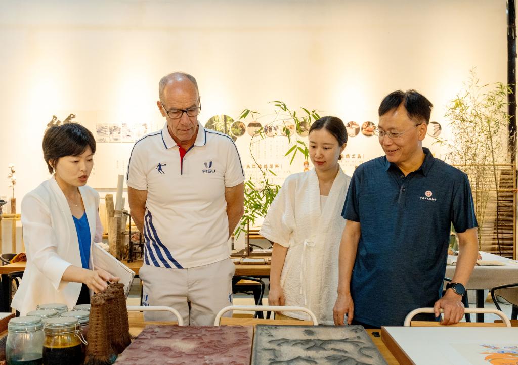 雷诺·艾德一行首先来到传统工艺研究院参观。在成都大运会举办期间,这里是颇受运动员和随团官员欢迎的中华文化体验区。雷诺·艾德一行饶有兴味地听取讲解,一边了解蜀锦蜀绣、漆艺、陶艺等背后的中华文化意涵,一边亲身体验扎染技艺制作T恤衫。