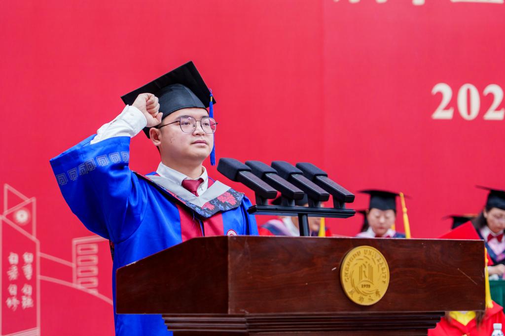 斯特灵学院首届毕业生、网络与新媒体专业钮芷莹同学作为毕业生代表发言。她分享了自己毕业论文的致谢内容,向大学初进校时遇到的热情帮助自己的志愿者致谢,而当自己成为大运会志愿者时,感受到了成大的温度在接力,这是青春最温暖的注脚;向自己随身携带,记录了自己成长,找寻到热爱的笔记本致谢,纸页上镌刻上新闻人接力棒的纹路;向大学期间鼓起“第一次”的勇气致谢,勇气的背后是被学校、学院托举的底气。而那些迈出的“第一步”,已铺就成坦途。