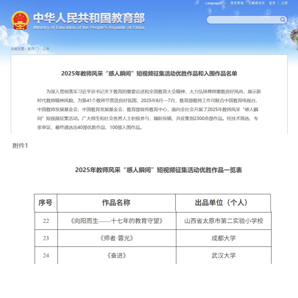 我校《师者·蓉光》喜获教育部教师风采“感人瞬间”短视频征集活动优胜奖2025/09/08
