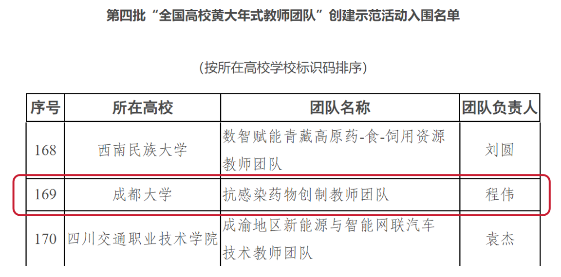 9月5日,教育部印发通知公布第四批“全国高校黄大年式教师团队”创建示范活动入围名单,我校由程伟教授牵头建设的抗感染药物创制教师团队成功入选,实现我校国家级教师团队“零的突破”。