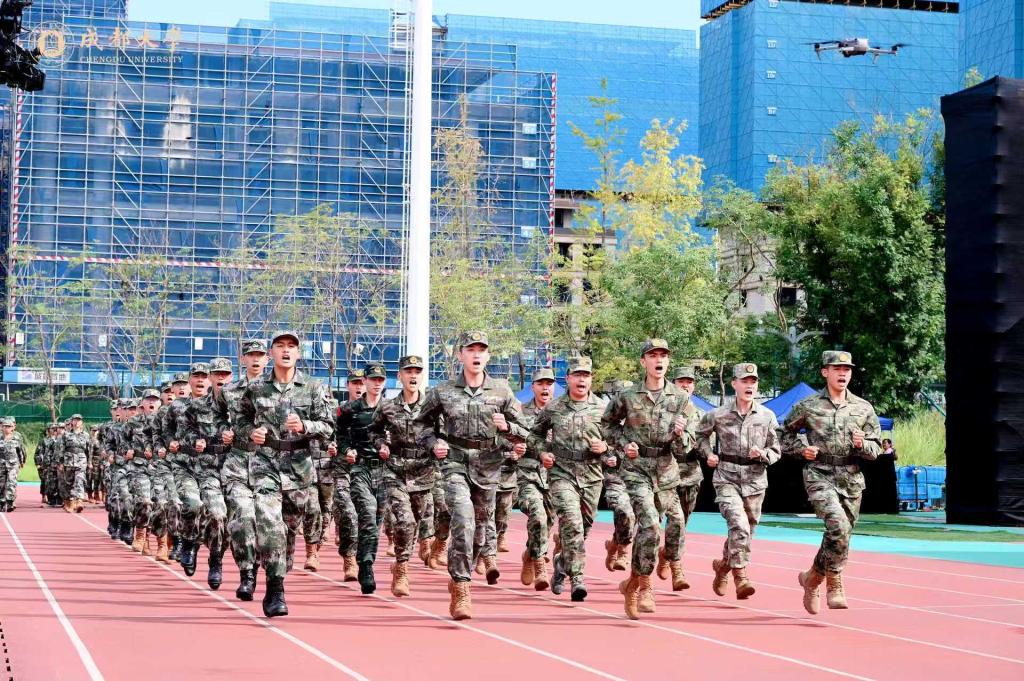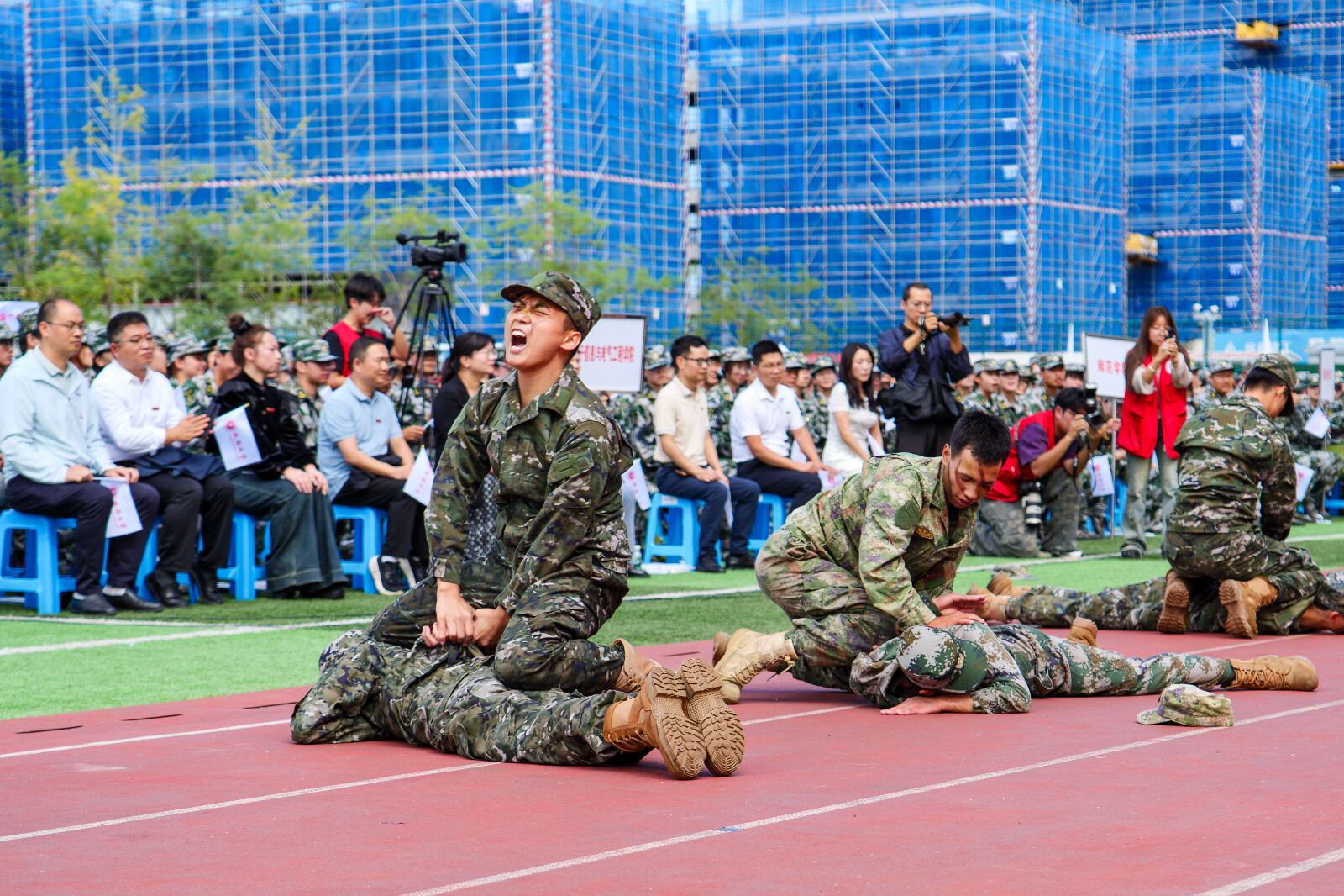 仪式上,学校预备役分队带来的风采展示。他们以撼人心魄的气势、整齐划一的动作和昂扬的精神风貌展示了“召之即来,来之能战,战之必胜”的使命与决心。“立正稍息”“齐步走正步走”……队列展示的每一个动作都干净利落,步伐砸地有声,铿锵有力。音乐切换,队列变换间,队员们手持仿真训练枪,突刺、防刺、击打,动作刚劲迅猛,一招一式虎虎生风。震天的口号声伴随着有力的动作响彻云霄;匕首操“挑、刺、抹、扎”,动作连贯流畅,攻防兼备;倒功表演将仪式推向高潮。