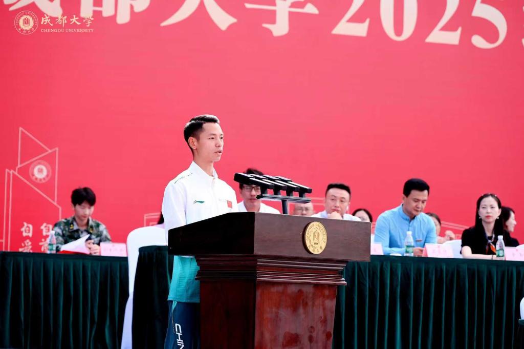 成都世运会中国团队飞盘队队长、成都飞盘大体育文化发展有限公司创始人、2017级休闲体育专业校友刘波致辞。他说,在今年的成都世运会上,有幸入选团队飞盘中国代表队并担任队长,与来自母校的学弟学妹在世界级赛事的舞台上并肩作战,并取得历史性突破。回首来时路,每一个成长脚印都离不开母校的滋养。他希望学弟学妹们勇敢尝试,寻觅心中所爱;持之以恒,让热爱催化成长;统筹兼顾,珍视情谊,建立深厚的师生与同窗之缘。