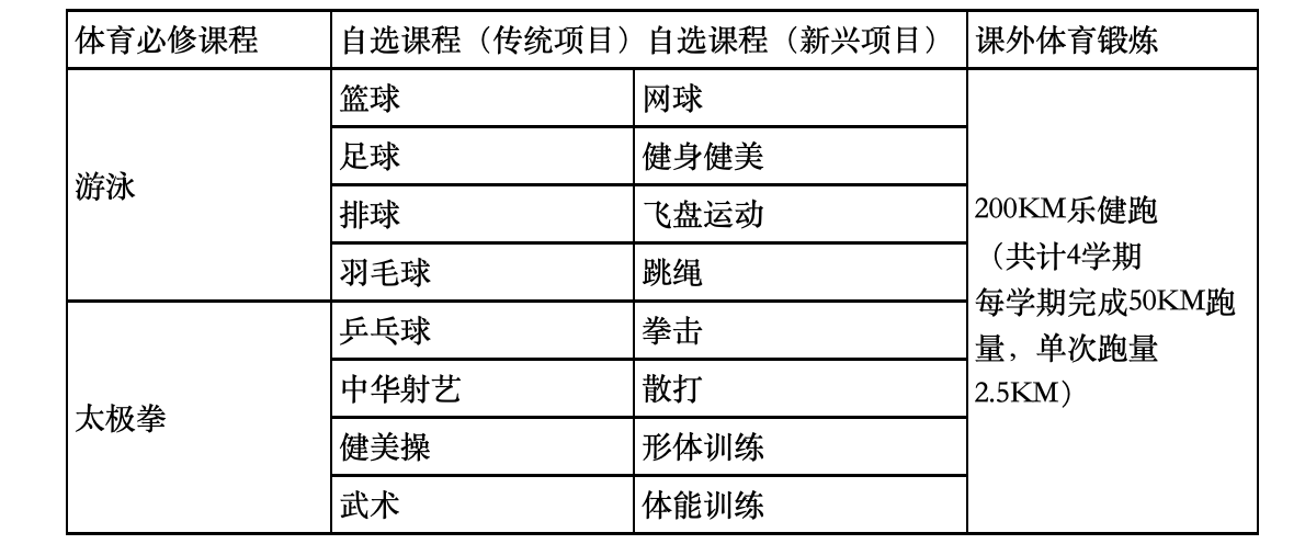 如今,成大公体课已形成特色体系,学生必会六项:“1 跑 2 会 3 能”(即‘1 跑’:校园健身跑;‘2 会’:会 24 式简化太极拳、会游泳技能;‘3 能’:能完成体能测试、能组织群体活动等)。”