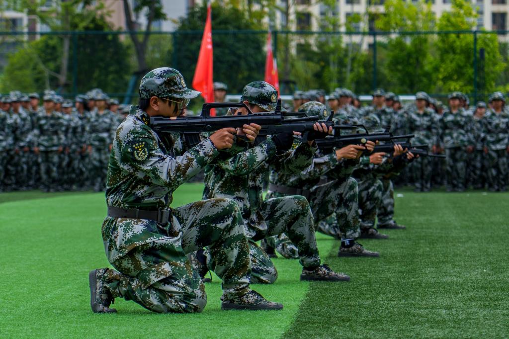 军训汇报展示,全方位展示新生们的军训成果。首先登场的是女生军体拳方队,她们目光如炬,一招一式刚柔并济,展现出“巾帼不让须眉”的飒爽风姿。匕首操方队手持短刃,惊艳亮相,“犯我中华者,虽远必诛”的口号响彻云霄。“杀”声震天,刺杀操方队持刀出场:突刺、格挡,每一个动作都充满力量。应急棍方队接踵而至,舞棍生风,劈扫有力,动作一气呵成。彩烟弥漫,战术表演方队脸涂迷彩,手持战术装备,或匍匐或半蹲着向场地中心移动,用战术手语和动作模拟战场情境,最终成功解救被俘人员。