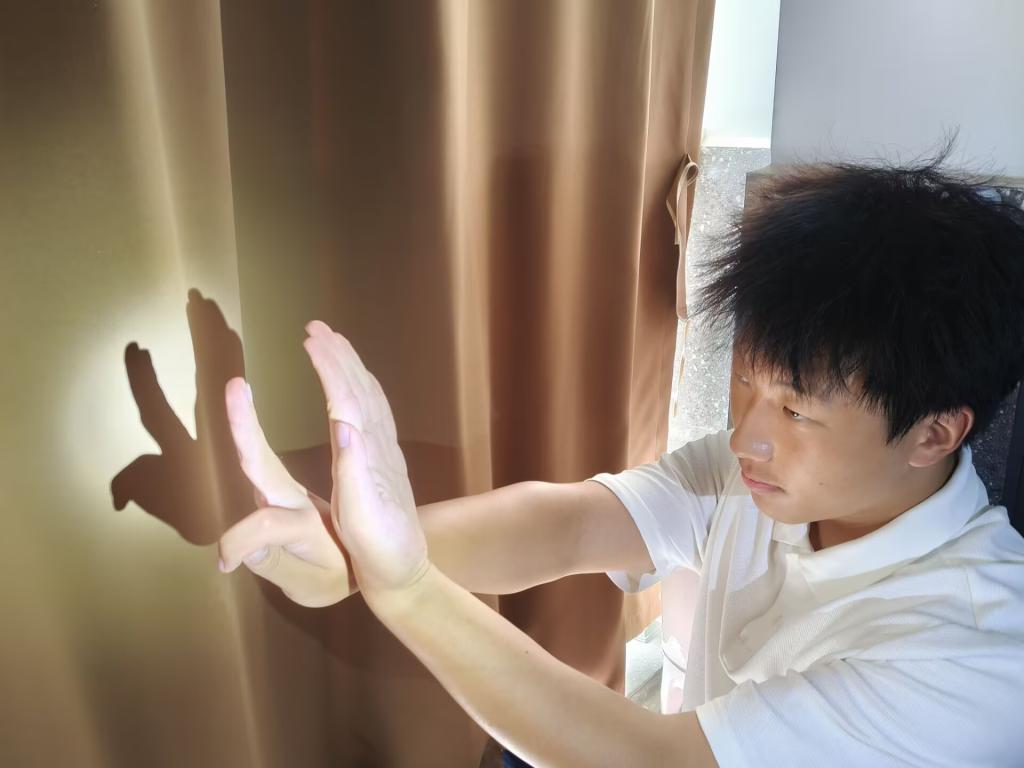 热爱是我学习手影戏的原始驱动力,也是向英老师的收徒标准。指尖的弧度要准,手腕的力度要稳,连光影的角度都要反复调整,直到每只“动物”都能在幕布上“活”过来。所谓“台上十分钟,台下十年功”这看似简单的动作,要想做得准确又灵动,少不了成百上千次的机械练习。我挤出课余时间向老师“取经”,顶着酷暑反复排练,最终受邀录制江苏卫视的一档节目《了不起的孩子》,将“拯救地球,保护环境”的主题以手影戏的方式呈现,让手影戏亟需传承的声音被更多人听到。