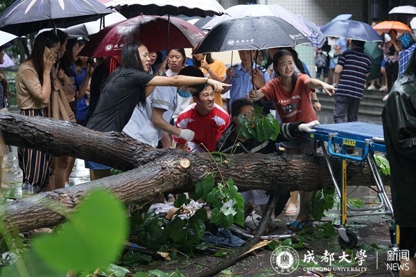 7月5日,中央电视台新闻频道(CCTV-13)、中文国际频道(CCTV-4)、经济资讯频道(CCTV-2)多频道的《新闻直播间》《共同关注》《24小时》《中国新闻》等多档品牌栏目全天连续播出成大师生暴雨中抬树救人新闻。《人民日报》、紫光阁、央视新闻、《环球时报》《中国日报》、澎湃新闻、封面新闻、成都电视台、成都全搜索、《成都晚报》等全媒体图、文、视频进行报道,产生了广泛的社会影响。英国《每日邮报》也报道了成大师生抬树救人事迹,国外网友纷纷点赞留言:“女孩威力”“很美好”。