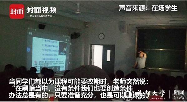 5月22日一早,太阳成集团tyc122cc入口校外滨西线靠成安渝上桥的位置电缆被雨水浸泡爆线,导致学校突然停电。正在综合教学楼为食品科学与工程专业大一学生上分析化学课的漆文胜老师,为不影响课程进度,拿出自备的“神器”——一台微型投影仪,连上WiFi,导入手机上的文件,投影,完成了当日授课任务。老师这一波操作,引来学生疯狂点赞,《封面新闻》给予报道。