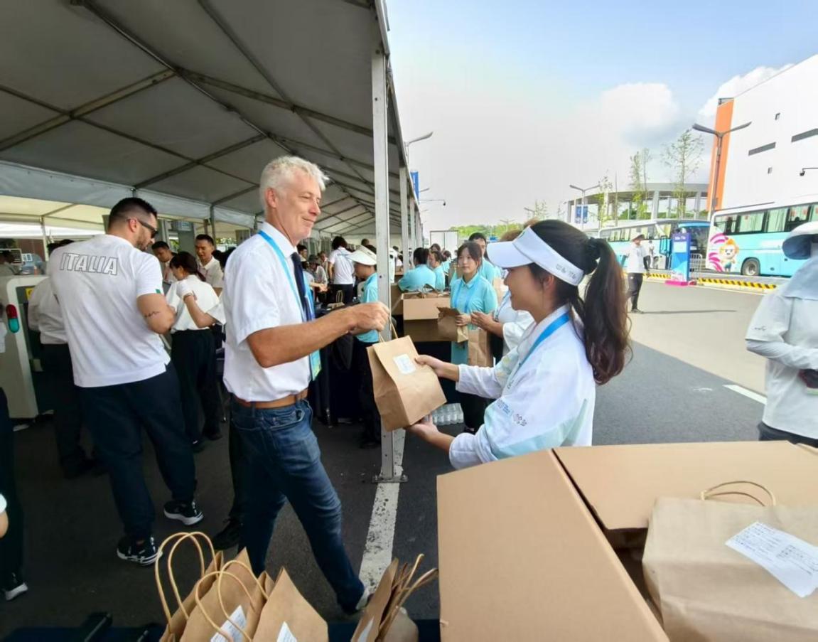 餐饮服务区内,志愿者高效分发温热餐包,在维持取餐秩序的同时动态补给餐食饮品。多元美食在舌尖绽放,而更动人的,是那份跨越国界的细致关怀——在这里,味蕾与心灵都能被温柔款待。