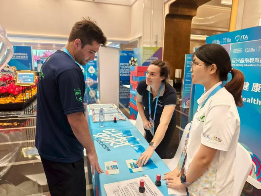 兴奋剂检查区里,陪护员助理志愿者是公平守护者。培训时专注记录每一个流程细节,工作中全程严谨陪护,确保检查环节零误差,为赛事纯粹与公正筑牢防线;反兴奋剂宣传志愿者则以创新方式开展宣传活动,通过趣味互动游戏,引导运动员学习反兴奋剂知识,完成挑战获得印有“IKEEPSPORTREAL”的ITA专属徽章,助力筑牢反兴奋剂防线。