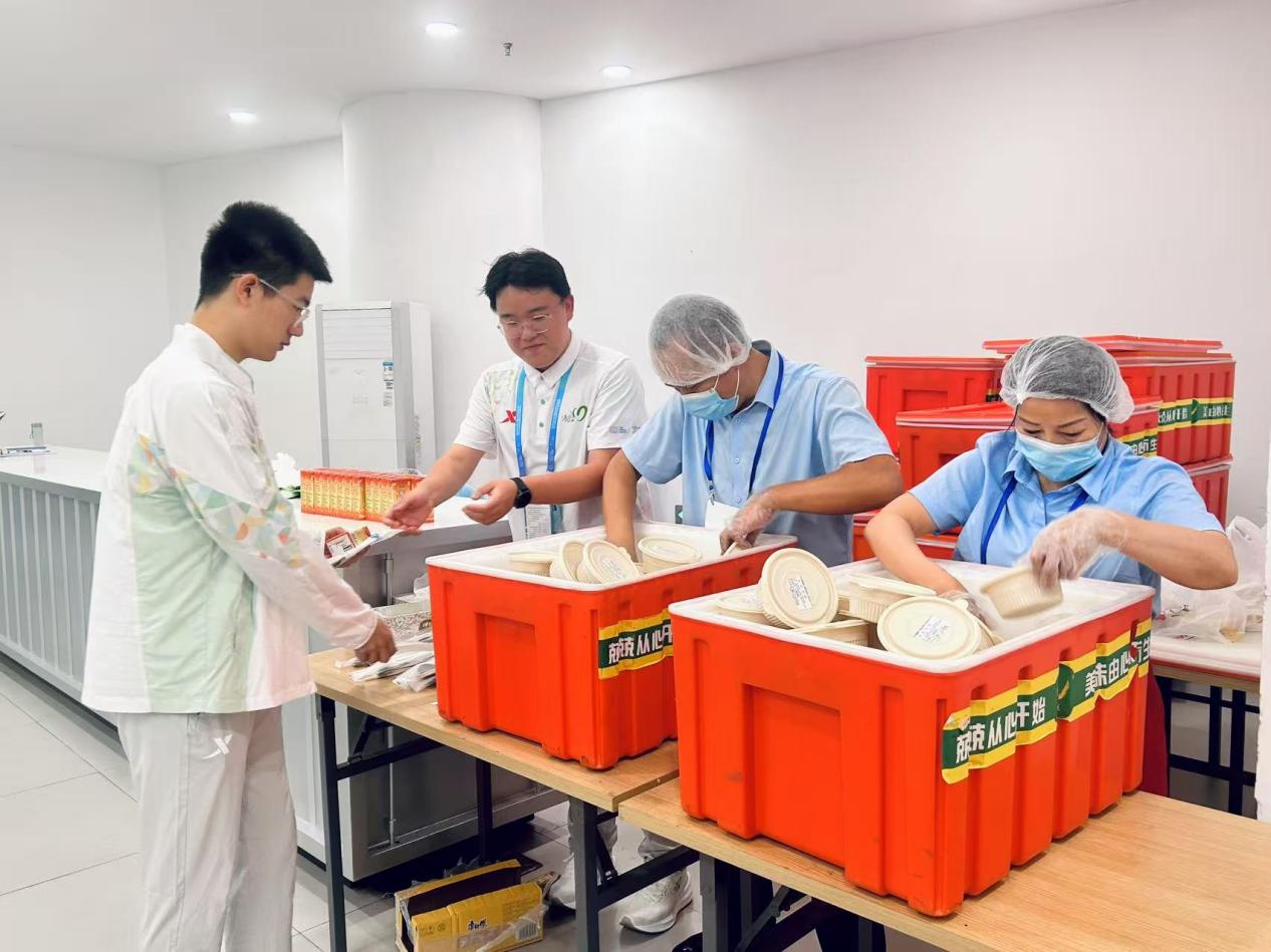 在餐饮服务区,志愿者们用心筹备安排,帮助场馆人员积极推进工作。