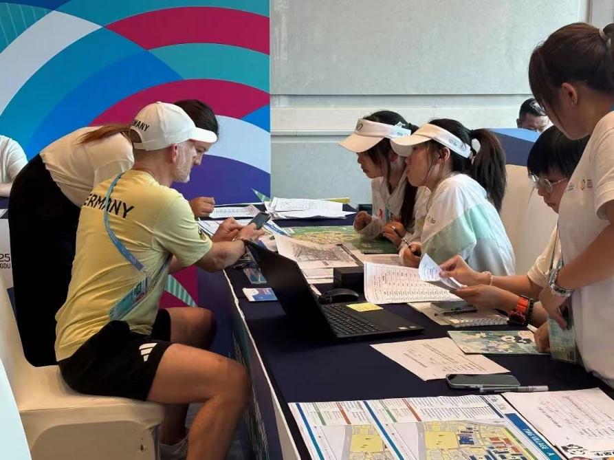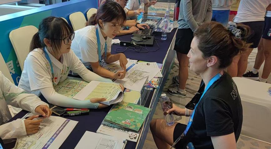 德国运动员向志愿者咨询比赛项目的赛事安排