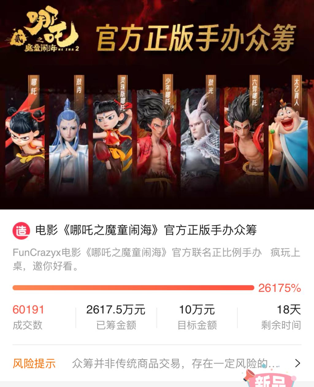 同样火爆的还有FunCrazy与《哪吒2》联名的手办众筹项目。记者注意到,该项目的众筹目标金额为10万元,截至记者发稿前,该项目的成交数就达到了60191单,已筹金额达到2617.5万元。目前,距离该项目结束还剩18天。