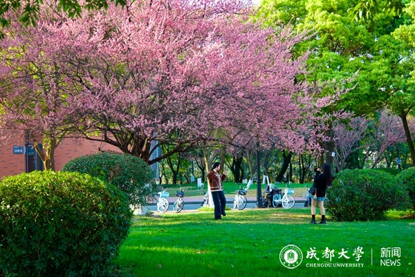 翠绿生机映衬着点点粉意,排列整齐的自行车尽显春日光景