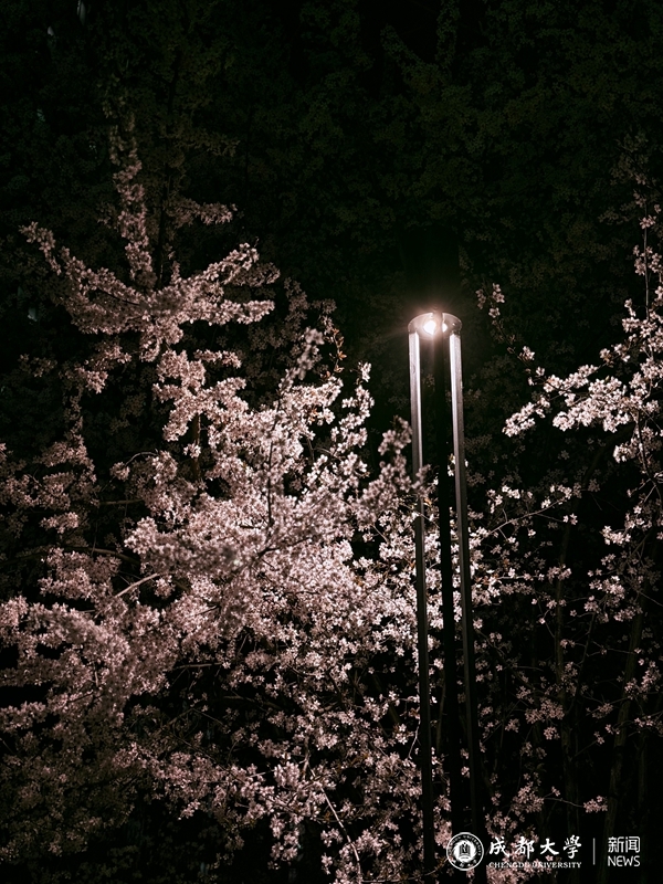 在路灯暖光的晕染下,粉白的花瓣闪烁微光