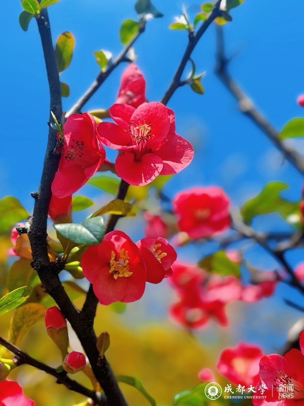 贴梗海棠以蓝天为幕,在阳光下肆意生长