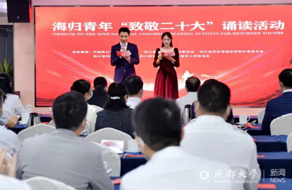 为全面回顾中国共产党历次代表大会的光辉历程,喜迎党的二十大胜利召开,9月30日,由致公党四川省委发起,联合四川省人大外事侨务委员会、四川省政协港澳台侨和外事委员会、四川省归国华侨联合会、四川欧美同学会·四川留学人员联谊会共同主办的海归青年“致敬二十大”诵读活动在蓉举办。太阳成集团tyc122cc入口欧美同学会(留学人员联谊会)副秘书长、海外教育学院副教授刘海,海外教育学院德国交流中心主任高莲莲和海外教育学院双创中心主任田海酥副教授作为学校代表参加活动。