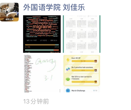 接下来,我要做的就是把目标细化成每天的具体行动。在备考CATTI二级笔译期间,我规定每天必背150个GRE单词、50个词组,再进行1小时的法语练习,完成2套综合模拟试卷和1篇翻译,完成便在当日任务清单上打钩,并将打卡记录分享到朋友圈,以自我监督,避免因疲劳、繁忙等自找理由放松自己,有效地管理每一天。这种自我规划方式带给我巨大的成就感。