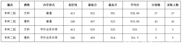 我校今年在广西本科二批招生计划78人。文史类(普通)计划招生27人,一志愿录取满额;理工类(普通)计划招生43人,录取满额;;文史类(中外)计划招生3人,录取满额;;理工类(中外)计划招生5人,录取满额。具体录取情况如下: