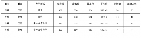 我校今年在福建本科招生计划75人。历史类(普通)计划招生20人,一志愿录取满额;历史类(中外合作)计划招生4人,一志愿录取满额;物理类(普通)计划招生44人,一志愿录取满额;物理类(中外合作)计划招生7人,一志愿录取满额具体录取情况如下: