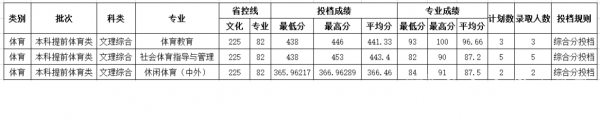 今年我校在广西体育本科批投放计划10名,一志愿投档满额。按综合分投档,综合分=文化总分×70%+体育高考成绩×(750/100)×30%。具体录取情况如下: