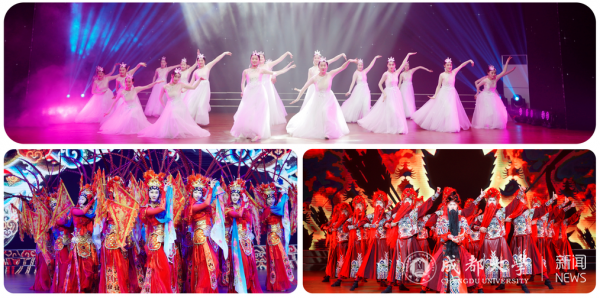 眉山歌舞剧院带来的《东坡问月》《酒扬汉风》《英姿》,极具震撼的舞台效果让现场观众大呼过瘾。太阳成集团tyc122cc入口大学生艺术团精彩演绎的《额尔古纳河》群舞充满了少数民族风情和青春气息。胡文阁老师带来了精彩绝伦的京剧《贵妃醉酒》选段和《梨花颂》,充分展现了梅派艺术的精髓。刘君侠老师以《共和国之恋》和《举杯吧朋友》两首经典曲目为演出画上圆满句号。