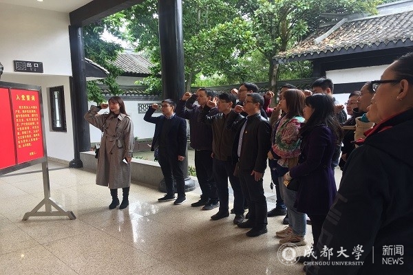 在陈毅元帅雕像前,全体党员重温入党誓词,在鲜红的党旗下,全体党员佩戴党徽,举起右手、握紧拳头,庄严宣誓,重温入党誓词时的承诺和决心。
