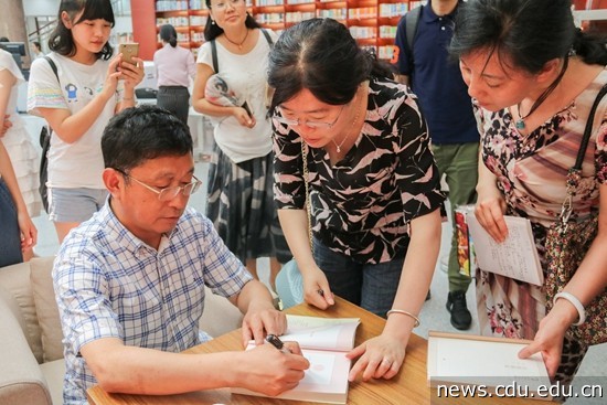 讲座结束后,师生们纷纷拥上前台,与阿来合影留念,寻求书籍签名。