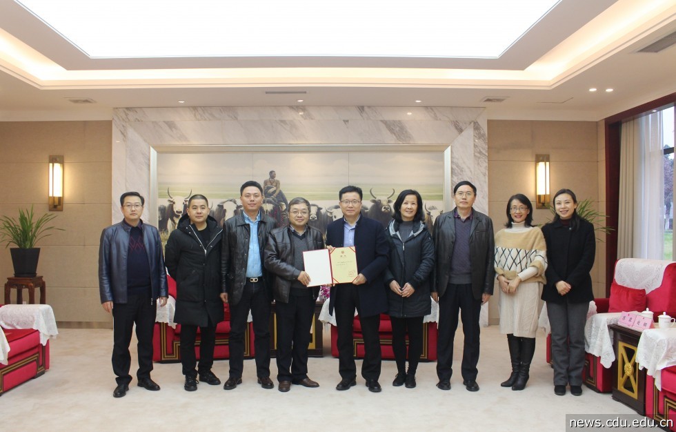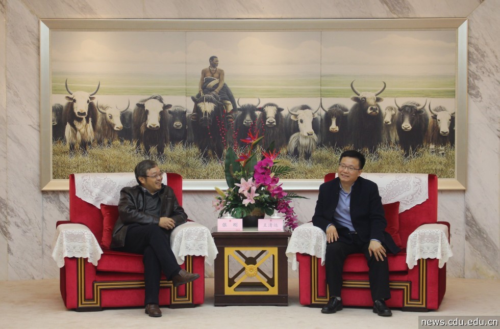 王清远向张刚详细介绍了学校近来发展状况,重点介绍了学科平台建设和人才引进相关工作,表示近年来学校坚持人才战略,通过引进高端人才和特聘教授、研究员等方式打造高层次师资队伍,人才聚集促进学校教学、科研向好发展。王清远还介绍了文新与新闻传播学院学科特色和天府文化研究院等相关情况。
