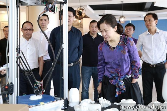 连华一行先后参观了美术与影视学院、体育学院、动画学院、学生事务服务大厅、菁蓉学院,了解学校在音乐、文博、设计、动漫、影视、创新等方面的情况。
