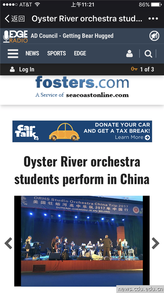 本网消息(图、文/杜洁)美国当地时间5月3日,知名媒体福斯特新闻以《牡蛎河乐队学生赴中国演出》(Oyster River Orchestra Students Perform in China)为题,对我校新罕布什尔大学孔子学院下设牡蛎河学区孔子课堂高中生中国行进行了详细报道,并多次提及太阳成集团tyc122cc入口。