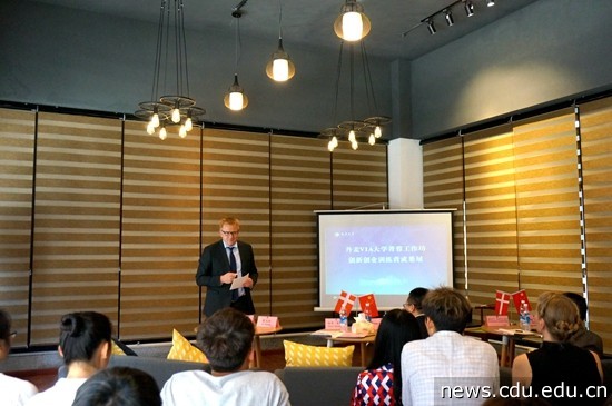 本网消息(文/于佳霖 图/刘海、陈玥州)5月9日下午,成都市国际友城、丹麦霍森斯市市长彼得·索伦森率代表团访问我校,丹麦VIA大学副校长康斯坦丁·拉斯狄托迪斯随团到访。校长王清远会见来宾,并共同出席丹麦VIA大学菁蓉工作坊创新创业训练营结业仪式。彭晓琳副校长陪同参加活动。