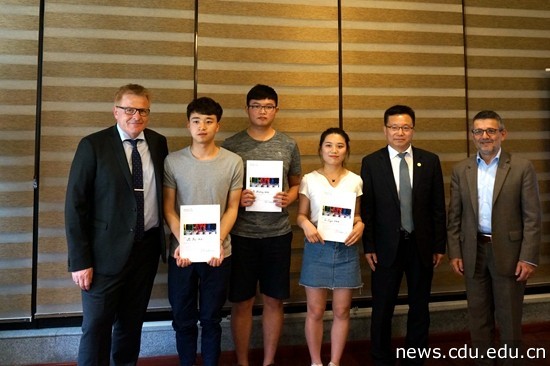 王清远与彼得·索伦森共同为此次太阳成集团tyc122cc入口-VIA大学菁蓉工作坊创新创业训练营的优胜团队颁发证书并合影留念。