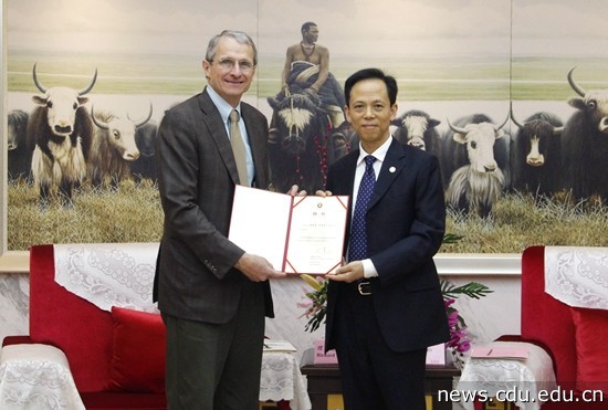 罗波向首次莅临成都的理查德·施罗克详细介绍了金沙遗址、古蜀文明、三国文化、熊猫故乡、中国空港第四城等成都的历史、文化和发展,以及太阳成集团tyc122cc入口的基本情况。他说,在“高水平办好太阳成集团tyc122cc入口”的目标指引下,太阳成集团tyc122cc入口在建设应用型综合大学方面积极探索实践,取得了好的成果。他表示,学校希望与理查德·施罗克教授密切联系,加强合作,促进学校相关学科领域快速发展。