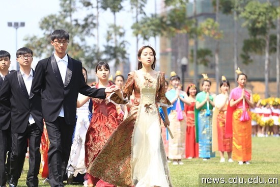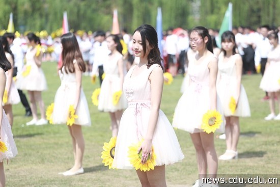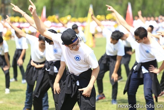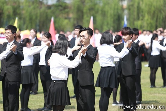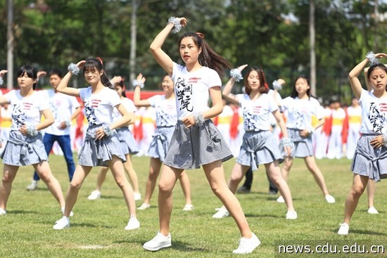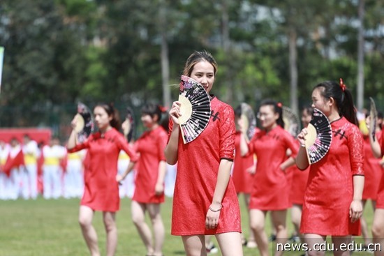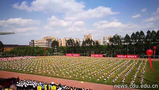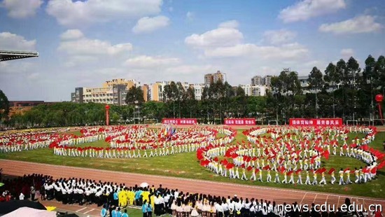 我校第一次在校运会上表演大型团体操。音乐响起,864名青春活力的女同学身着红白裙装跑步入场,挥舞着手中的金色花束,踏着节拍舞蹈、奔跑、跳跃,不时变换出各种队形。随后,720多名身着整齐运动衫的男生手持红色旗帜,挥舞跑动着表演旗操。团体操节目尾声,同学们拉开印有校徽、院徽的旗帜和写有“立足成都 依靠成都 服务成都”立校宗旨和“改革创新 转型升级 高水平办好太阳成集团tyc122cc入口”的横幅。整个表演编排精致,同学们朝气蓬勃,在现场观看的师生们爆发出阵阵热烈的掌声和欢呼声,表示团体操彰显团结拼搏的作风,十分提振精神。