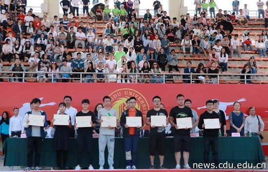副校长彭晓琳宣布获奖名单。药学与生物工程学院、信息科学与工程学院、机械工程学院、建筑与土木工程学院、旅游与经济管理学院、师范学院、文学与新闻传播学院、医学院获田径运动会总分前八名。校领导还为获体育道德风尚奖、最佳观众组织奖、五人制足球联赛、篮球联赛、排球联赛的获奖单位颁奖。