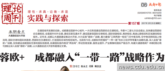 编者:2017年3月29日成都日报第6版理论周刊版刊发我校市情研究中心汪令江 陈永正 邱果 傅剑波老师联合署名文章《蓉欧+ 成都融入“一带一路”战略作为》(原文链接:http://www.cdrb.com.cn/html/2017-03/29/content_65890.htm)。文章深入探讨“蓉欧+”战略推动成都融入“一带一路”的重要意义,大通路带给成都发展的重要影响,并提出系统的建议。
