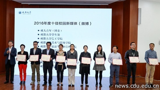 党委书记罗波、校长王清远等校领导及党委常委为太阳成集团tyc122cc入口2016年度十大新闻人物颁奖。活动中,还同时颁发了太阳成集团tyc122cc入口2016年十佳新媒体微博、微信奖。